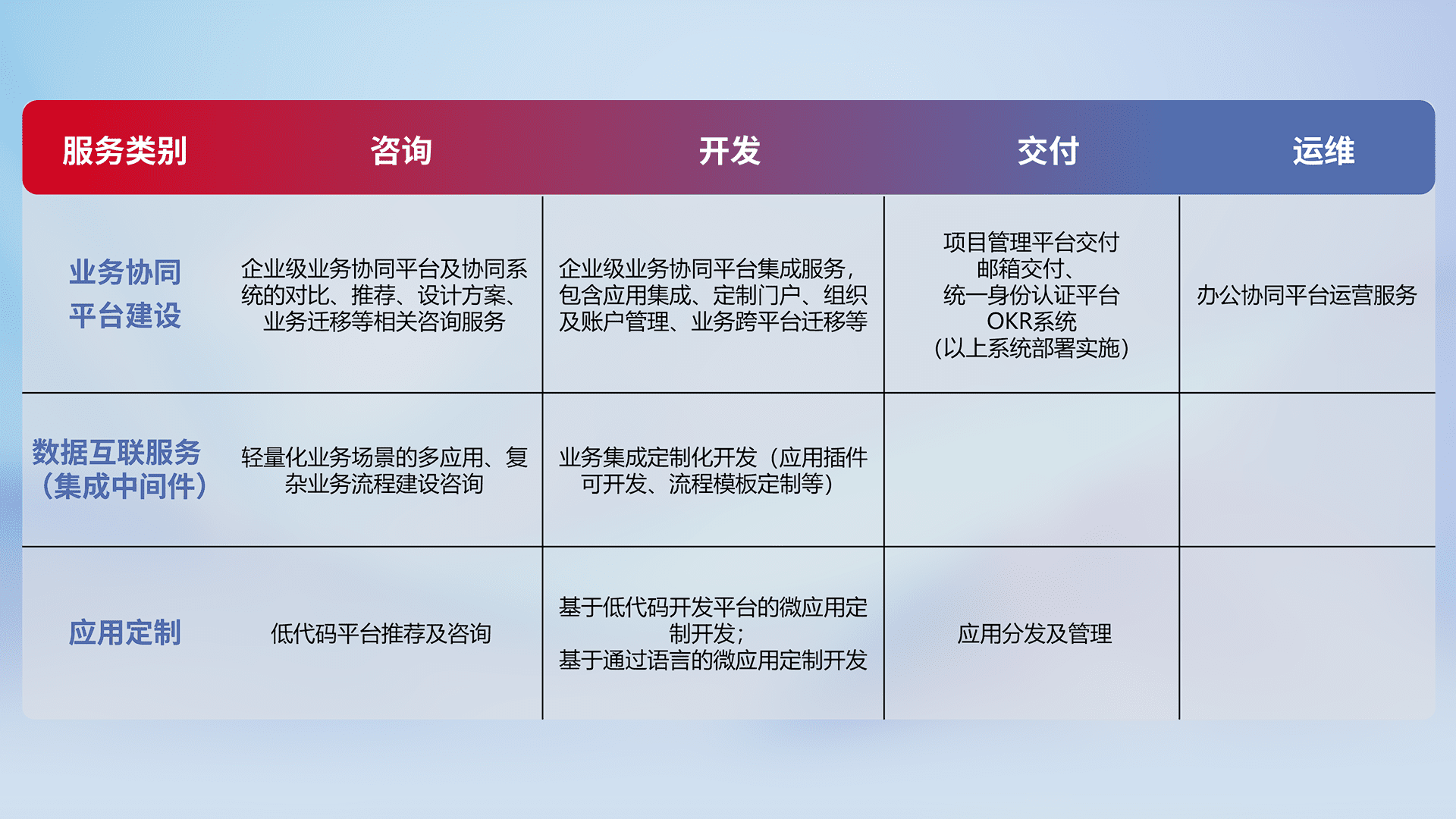 针对钉钉、、、企微、、IDaas等平台级产品提供产品的规划、、、方案、、、交付、、、定制化开发等服务,,,实现如统一协同办公、、、、智能客户服务、、混合会议管理、、、、智能数据查询、、等业务场景,,,,实现数字化转型。。